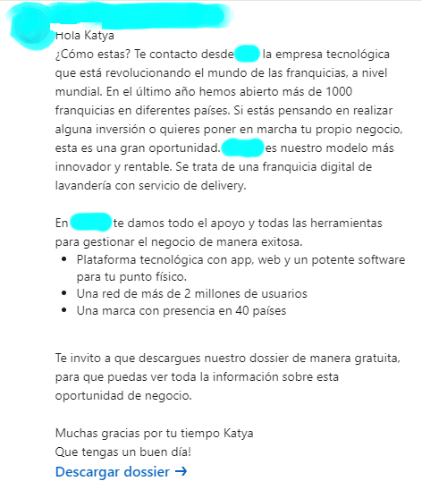 Aunque no es su contacto de 1er grado (pudo haberlo invitado a conectar primero), el mensaje está bastante personalizado y de hecho a mi cliente le interesó abrir el catálogo y conocer un poco más de sus productos.