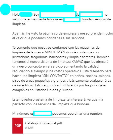 Este segundo caso es un mensaje de venta que le llego a un cliente que presta servicios de limpieza.